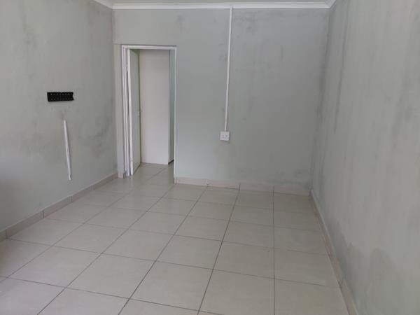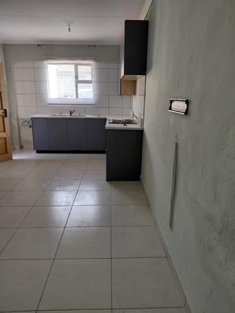 Kitchen with ample cupboards space, stove, space for fridge and 1 appliance.