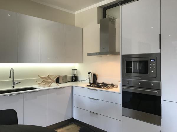 One bedroom fully furnished apartment to let at Central Square in Morningside, Sandton CBD, available immediately. Modern white finishes, convenient size kitchen, built in Smeg appliances.