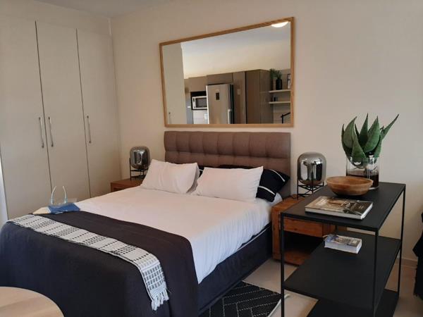 Ground floor Studio apartment available at the View in Morningside. Open Plan living Area. Modern Kitchen with stone work tops. Space for appliances. The spacious bedroom area has built in cupboards. Bathroom with shower and a basin. The living room leads out unto a little private courtyard.