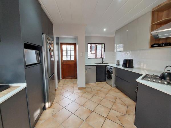 From the moment you step inside, youll notice the fresh renovations. The brand-new kitchen is a showstopper, with Caesarstone counters, a gas stove and electric oven, space for a double-door fridge, and plumbing for two under-counter appliances. Its designed for both everyday cooking and entertaining with ease. The open-plan living and dining area feels airy and inviting, with double doors opening onto a partially covered patio and your own private garden, the perfect spot for morning coffee or summer braais. A guest toilet is conveniently located on this level.