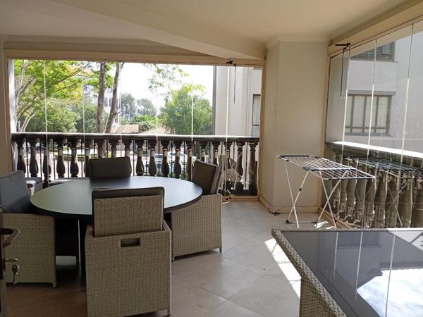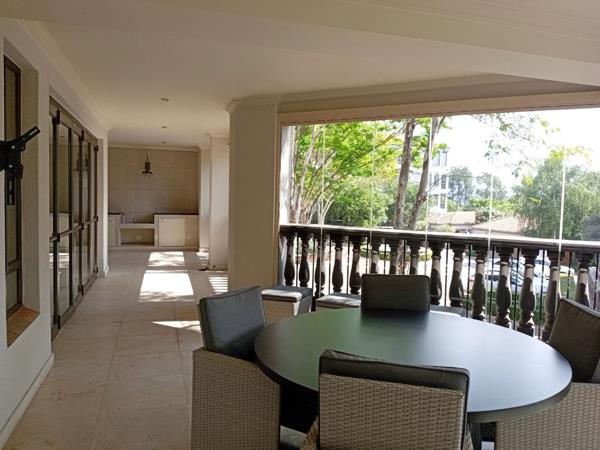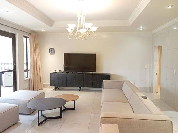 With double level security in a quiet boomed off area is this luxurious and spacious fully furnished 3 bed 2.5 bath executive apartment. As you enter the apartment through prestigious double doors, you are greeted by the spacious open plan living room area that opens out onto a wraparound balcony with the most amazing views. The balcony is a fabulous entertainment area with a braai area, patio seating and glass stacking doors all the way around. To the left of the living room is a separate dining area that has access to the large entertainment balcony. The kitchen has granite counter tops, new washing machine/drier combo, double door fridge and plenty of workspace and storage. The main bedroom is very spacious with access onto the balcony and the other 2 bedrooms are also spacious with a shared full bathroom.(Carpets in all the bedrooms). Extras include 2 indoor storage areas, 2 basement parking spaces, lifts, borehole water, backup power and 24 hour excellent security. This is luxurious living at its best!