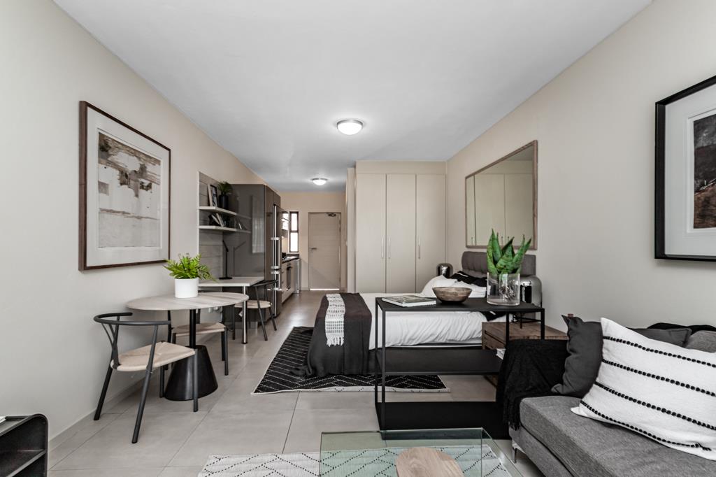 Discover a space that perfectly balances modern city energy with everyday comfort. This beautifully designed ground-floor studio apartment at The View in Morningside offers stylish open-plan living with the added luxury of a private terrace, ideal for morning coffee, quiet evenings, or a breath of fresh air after a busy day. The thoughtfully crafted layout features a sleek kitchen with stone countertops, an electric oven, gas hob, and extractor fan, while modern bathroom finishes and built-in cupboards keep the space both elegant and functional. Tiled living areas and prepaid electricity ensure easy, low-maintenance living designed for todays urban professional.