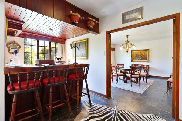 The downstairs area opens out to a cozy covered patio, large swimming pool, and beautiful, manicured garden, surrounded by mature trees and lush greenery,