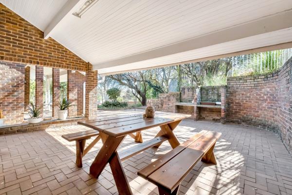 Positioned on a sprawling 2,159 sqm stand, this sunny and inviting residence welcomes you with an elegant entrance hall leading into expansive open-plan living areas. The dining room flows effortlessly onto a covered patio, overlooking lush gardens and a sparkling pool, perfect for year-round entertaining. A cozy fireplace adds charm to the bright, spacious lounge (currently used as a bedroom).
