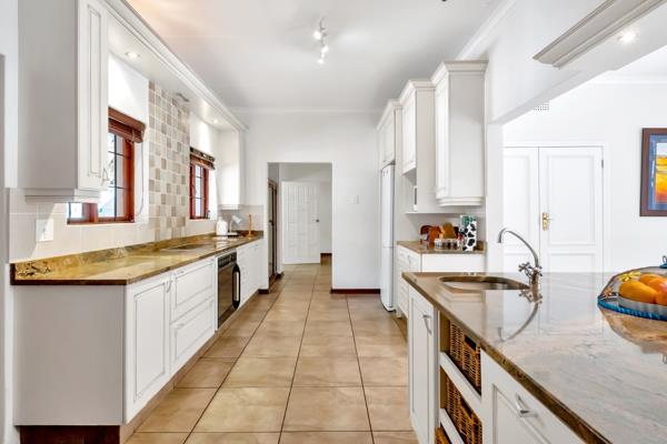 Modern, partly open-plan kitchen with granite countertops, scullery corner, and breakfast bar.