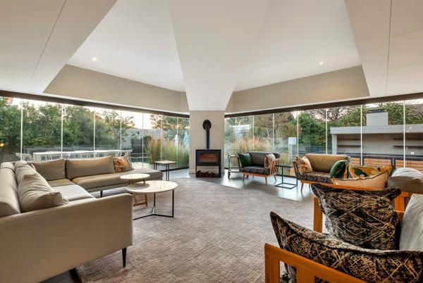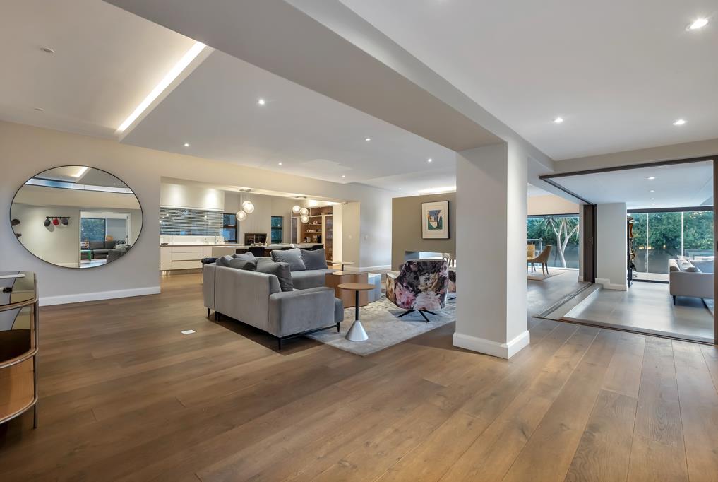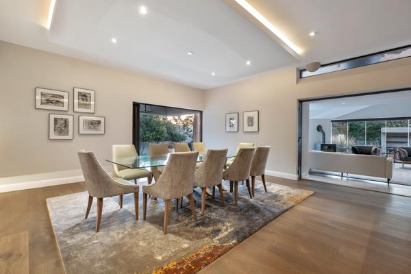 Step through the oversized glass swivel door into a world of sophistication: a gourmet kitchen with fireplace, pantry, cold room and sunny breakfast nook flows seamlessly to an all-weather patio, featuring pool, built-in bar/braai, seated firepit and lush gardens.