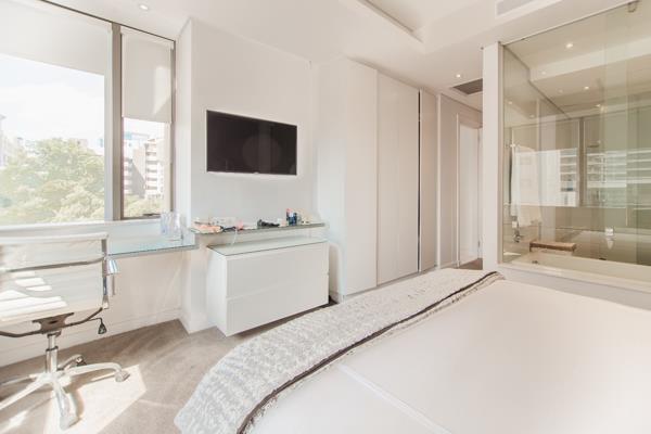 The bedroom is generously sized, fitted with a plush queen-sized bed, ample built-in cupboards, and floor-to-ceiling windows that invite in natural light while offering sweeping city views. Though the apartment lacks a balcony, its high-rise positioning ensures an expansive sense of space and elevation.