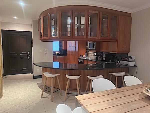 Modern designer kitchen with granite counter tops, breakfast bar, wooden cabinets, gas hob, 3 appliances. Easy access purified drinking water.