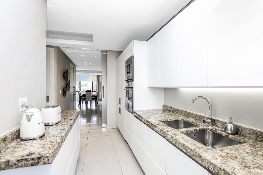 The modern kitchen features elegant granite countertops, a large pantry, and fitted double-door fridge and freezer, washing machine, and dishwasher. All appliances are neatly concealed for a sleek, contemporary look.