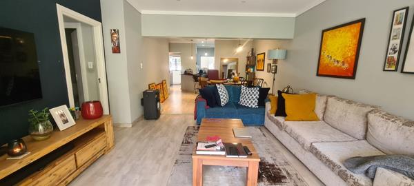 Dining area and spacious lounge leading onto a covered patio overlooking an established garden.