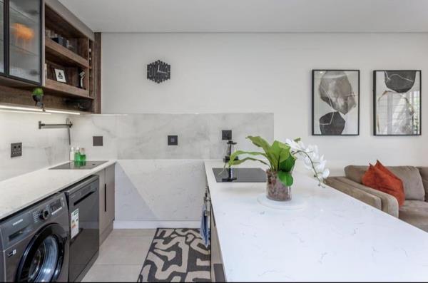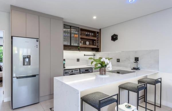 A designer kitchen complete with all appliances, marble bar counter, and sleek finishes.