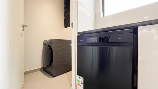 The sleek, modern kitchen is a highlight, featuring pristine white cabinetry, dark granite-style countertops, and durable tiled flooring. It comes equipped with integrated appliances, including a large Hisense fridge with a water dispenser, a built-in hob, and a convenient built-in Hisense dishwasher. A dedicated laundry alcove houses a Hisense washing machine, ensuring all your essential needs are met.