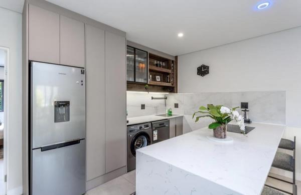 A designer kitchen complete with all appliances, marble bar counter, and sleek finishes.