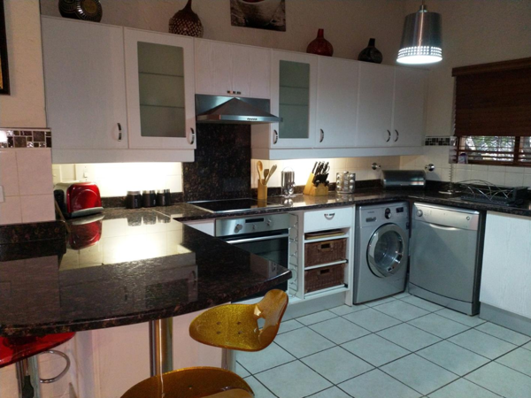 Granite countertops, fridge, washing machine, tumble dryer, dishwasher, microwave, and a cosy breakfast nook.
