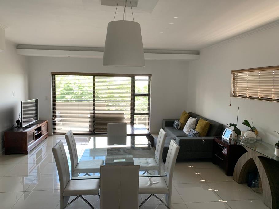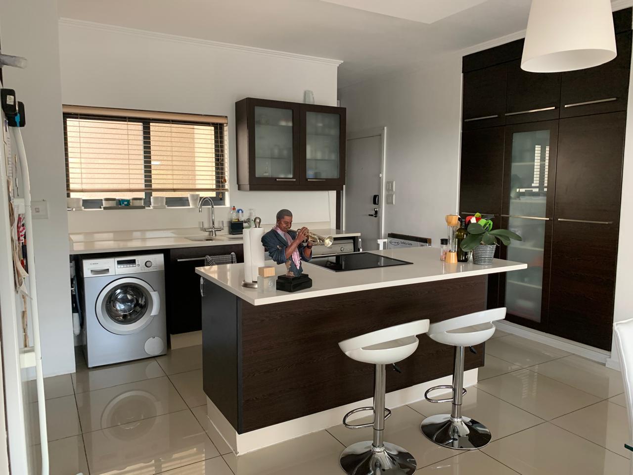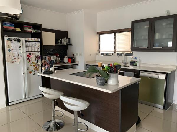 Step into a modern kitchen featuring rich brown chocolate cupboards, a sleek island with an induction stove, a double-door fridge, washing machine, and dishwasher perfect for effortless living. The open-plan layout flows seamlessly into the dining area, complete with a six-seater dining set, and a spacious lounge that opens onto a large balcony. Enjoy serene views of a lush green suburban garden a peaceful escape in the city.