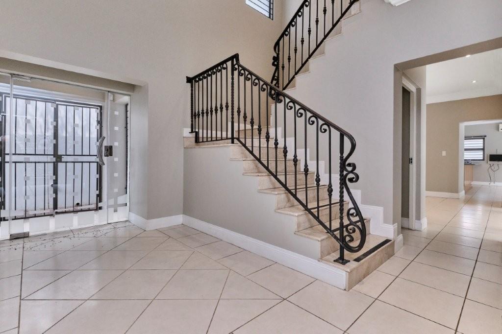 4 bed, 2.5 bath spacious double storey unfurnished cluster measuring 406sqm in excellent condition 3 generously sized tiled reception areas with access to a lovely covered patio with attractive private garden and sparkling pool. Beautiful kitchen with granite tops, 5 plate glass hob with oven, extractor fan, double door fridge and separate scullery with space for 3 water appliances. This property has previously been a diplomatic residence and is extremely secure. All bedrooms upstairs have carpet floors with security gate at the top of the stairs. Main bed is ensuite with full bathroom, lovely dressing area and balcony. The other 3 bedrooms share a full bathroom 4th bedroom has a built-in desk. Air conditioned, double auto garage with attached storeroom, two staff quarters, and fibre. Weekly garden and pool service R350.00 excluding chemicals. The pool is solar heated. Full electric fencing around perimeter, beams, alarm and tightly 24 hour manned security. Ideal as a long - term corporate or diplomatic rental.