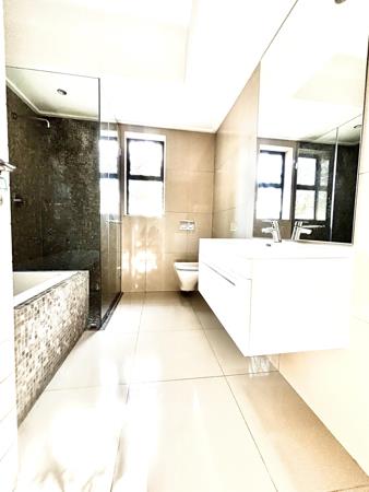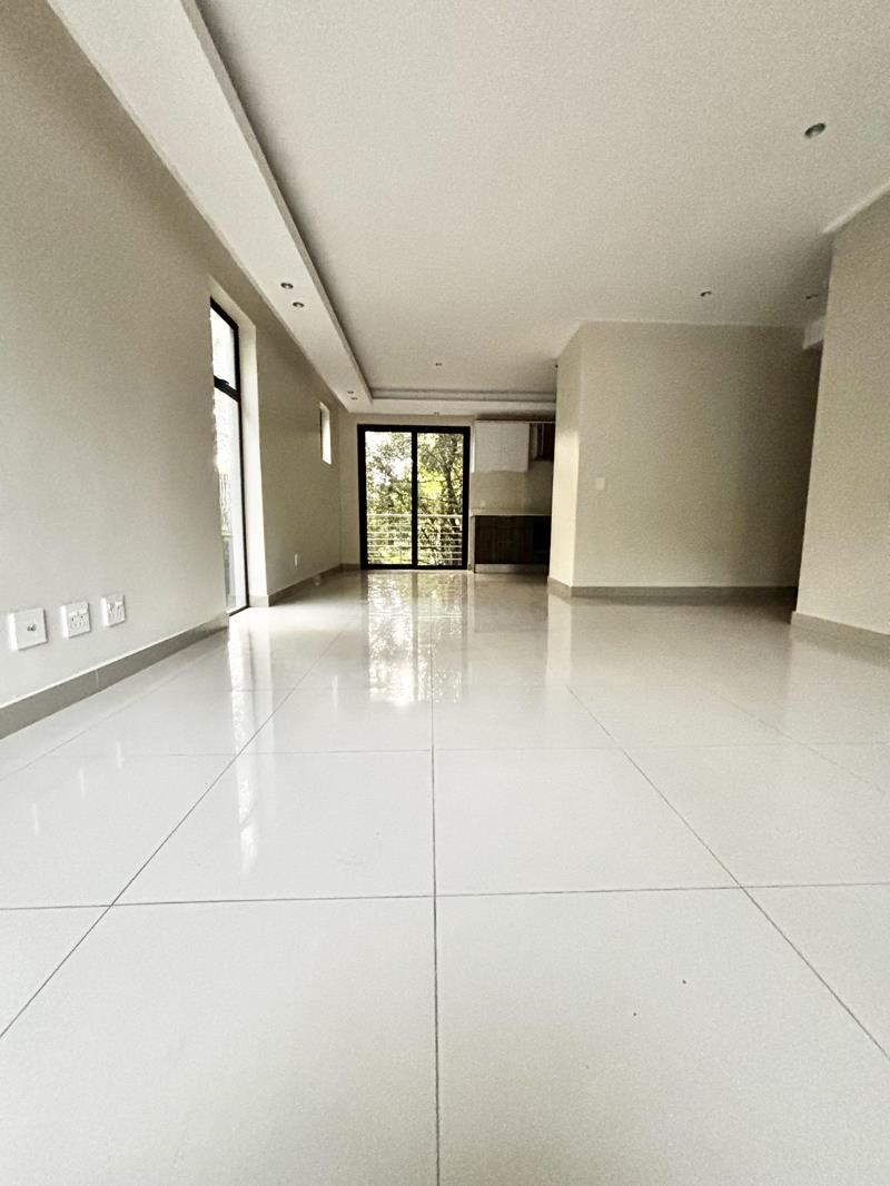 Polished white large tiles , with open sliding doors allowing for airy summer evenings and mornings , Juliette balcony lookout views over Sandton .