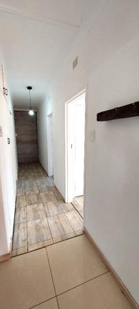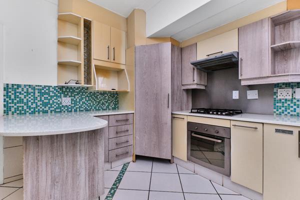 Open-plan living room includes large windows, natural sunlight, high ceilings and a working fire-place. Kitchen is spacious with ample cupboard space, a pantry cupboard, breakfast bar, electric oven, gas hob, space for 2 under-counter applicances and double door fridge. Passage leads to 2 spacious bedrooms and 1 bathroom with shower. Tiled throughout and Fibre ready.
