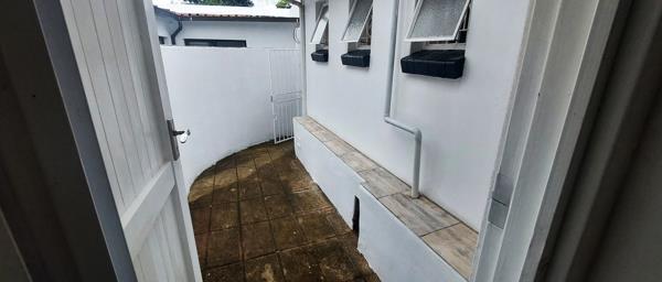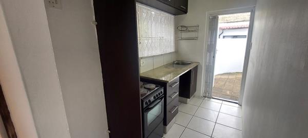 Modern open-plan living room features contemporary finishes, sliding doors to a paved outdoor area, large built-in-cupboard plus space for lounge and bedroom settings. Kitchen includes modern dark cupboards, electric stove plus space for 1 water appliance and fridge. Full bathroom and Fibre-ready.