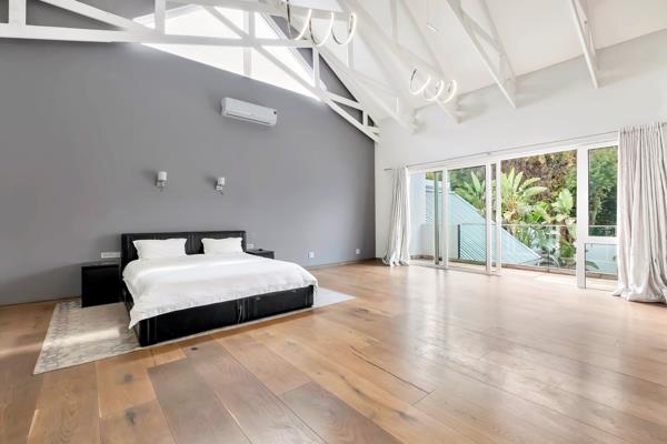 The ground floor includes a private studyplayroom, a full guest suite opening to the garden, an additional bathroom, a guest cloakroom, and a walk-in linen room. The upper level features a spacious family lounge, a spectacular master suite with a boutique-style dressing room and a spa-like en-suite, plus three loft-style bedroom suites with private bathrooms and access to a sun deck overlooking Sandton.