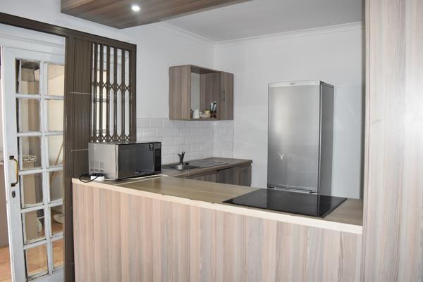 Available 1 December. Spacious 1 bedroom garden flat to let. Large covered patio with bar leads into a living area that can accommodate a lounge, dining area and work station. This is open plan to a well-equipped kitchen. The bedroom is huge and can easily fit a lounge and work area if required. It leads into a massive walk-in cupboard with loads of built in storage. The bathroom has a glass shower, soaking tub and is also very large. This lovely flat is situated below the main house and would be ideal for a young professional or couple. There is secure off-street parking for a single car. Please note that it is not pet friendly.