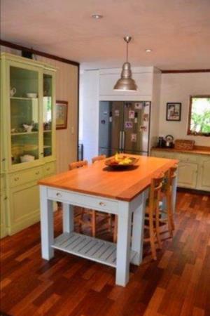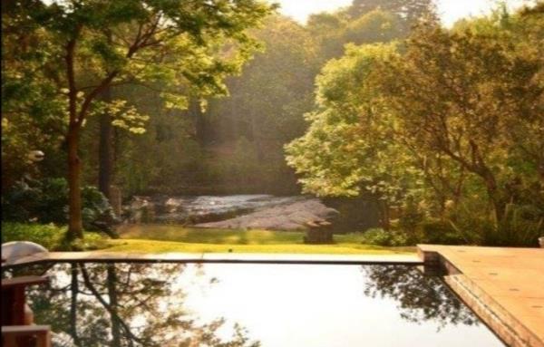 This fully furnished family home overlooks a garden, infinity pool, river, and large trees. The views and scenery make it look as though it''s out in the country.
