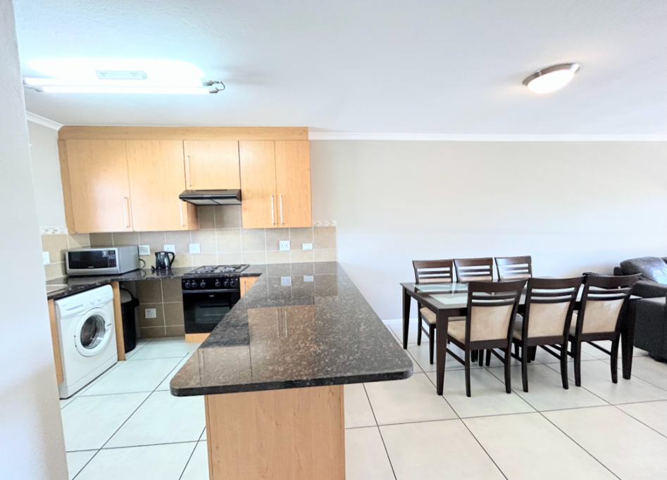 Open plan lounge and dining area that leads on to the balcony that has a fitted braai area