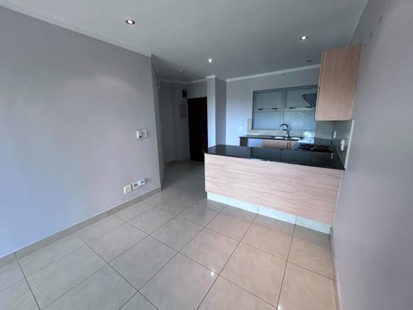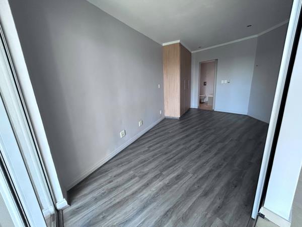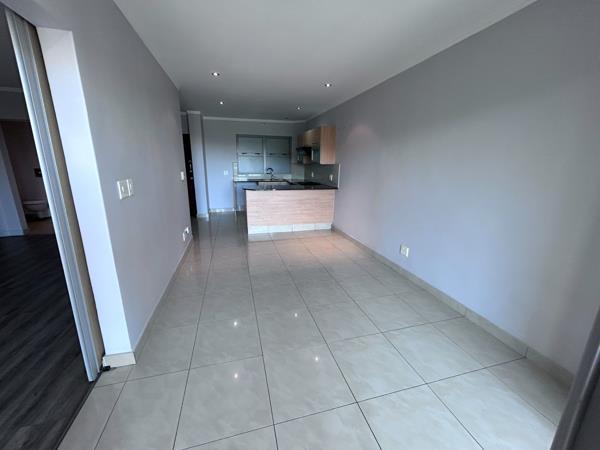 The apartment features an open-plan living and dining area that opens onto a private balcony with stunning city views. The kitchen is sleek and modern. The bedroom is spacious with built-in cupboards, and the bathroom is fresh and contemporary.