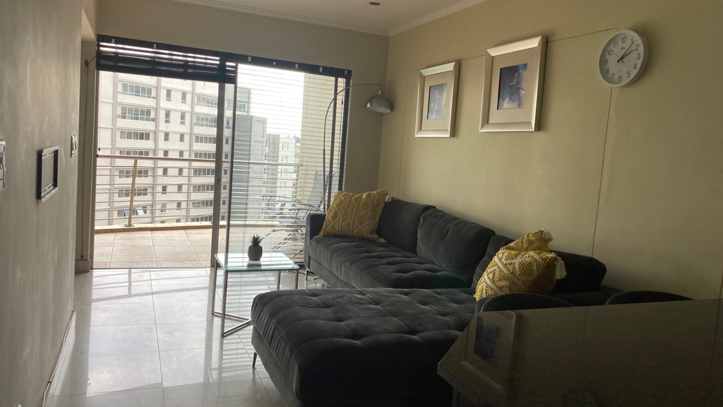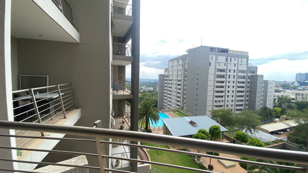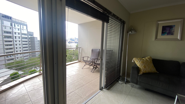 Step into a bright, open plan living space that flows effortlessly onto a spacious balcony furnished with outdoor chairs the perfect spot to unwind while taking in beautiful views of Sandtons skyline.