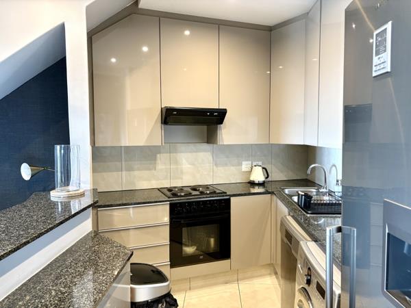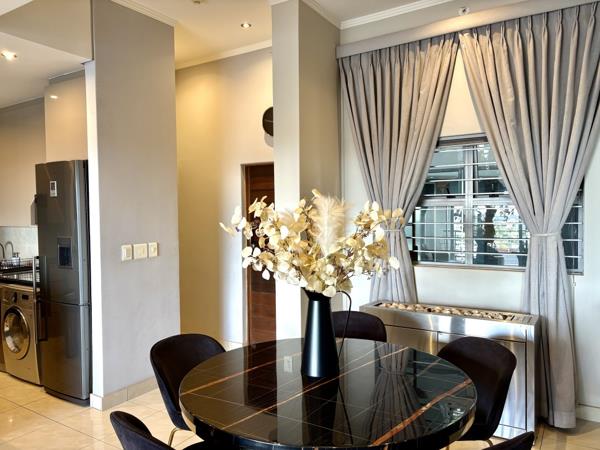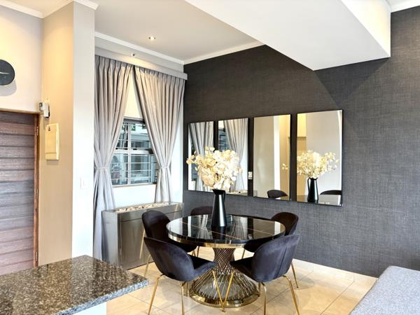 The entrance hall leads into the elegant open-plan living space. The combined dining room and lounge feature contemporary mirrors and stylish wallpaper, creating an atmosphere of sophistication. This area flows seamlessly onto a private, undercover patio and mdashyour front-row seat to the magnificent Sandton skyline.