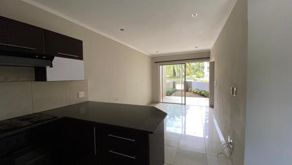 The interior features a seamless open-plan design with cool tiled flooring throughout, creating a modern and low-maintenance living environment. The kitchen is stylishly appointed with sleek dark wood cabinetry, durable granite countertops, and a convenient breakfast overhang that serves the spacious lounge area. Uniquely, both the living room and the generous bedroom feature floor-to-ceiling sliding doors that open directly onto a private covered patio and a manicured garden patch. This rare feature allows for excellent natural light and fresh air, blending indoor comfort with outdoor relaxation.