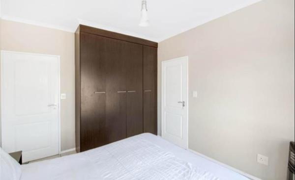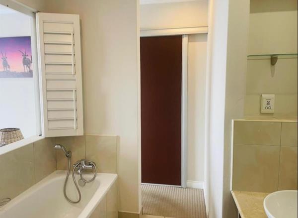 Two spacious, carpeted bedrooms with ample built-in cupboard space Main bedroom with en-suite bathroom featuring a bathtub, shower, and basin
