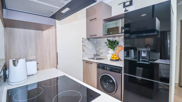 * Designer kitchen with built-in oven, modern glass-top stove, granite countertops, touchless gesture-controlled cooker hood, and space for an appliance.