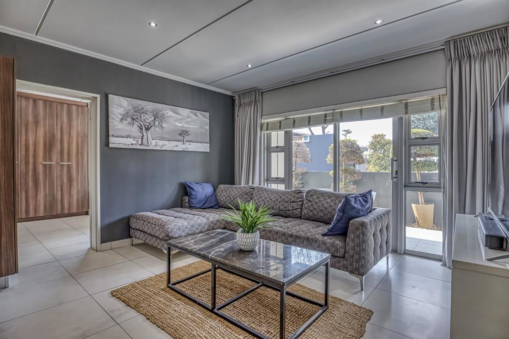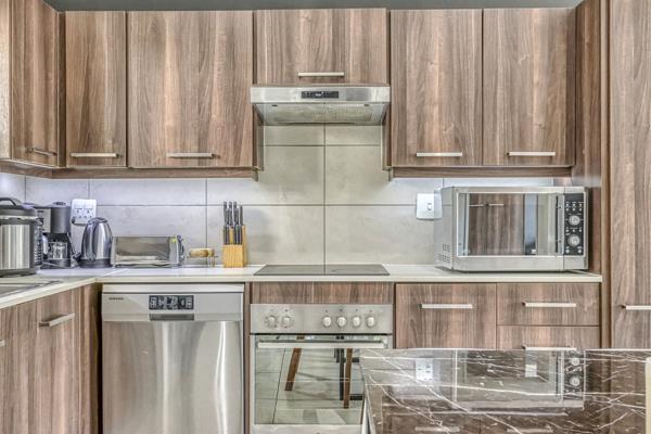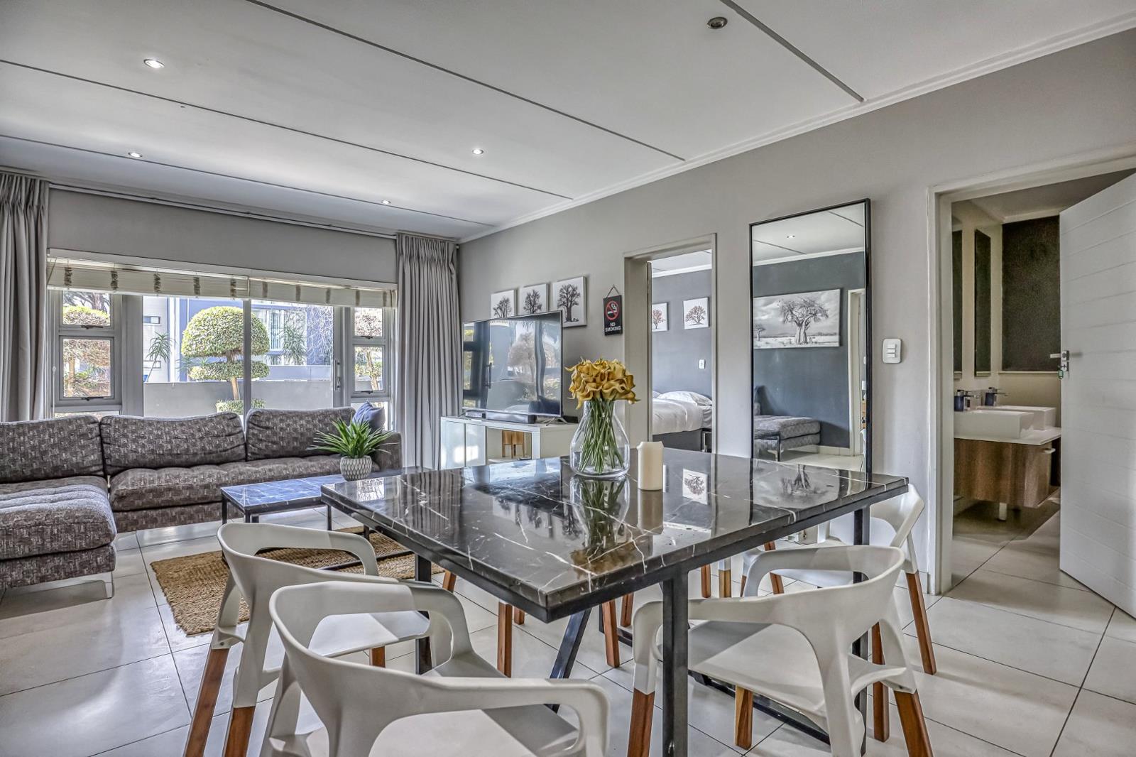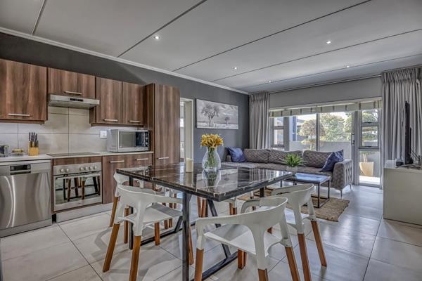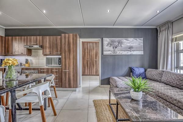 xperience the delightful fusion of comfort and luxury in this beautifully furnished apartment, perfectly situated in the heart of the lively Sandton hub. Spanning an impressive 102 square meters, this residence is thoughtfully designed to welcome an abundance of natural light into its spacious, open-plan layout. The kitchen flows effortlessly into the dining area and expands into a large lounge, where sliding doors open up to a generously-sized balcony, ideal for relaxation and entertaining.