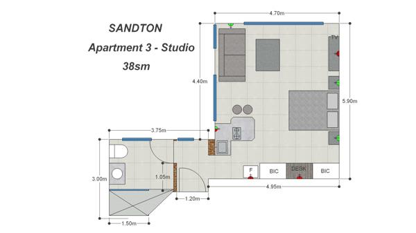 Spacious ground floor, one bedroomstudio apartment with outdoor patio in Sandton. Open plan - super modern contemporary living, only 2km from Sandton City - ample parking - excellent security - swimming pool - cleaning service & water included in rent - on site laundry service available for your convenience. Call Bruce. No agent calls please.