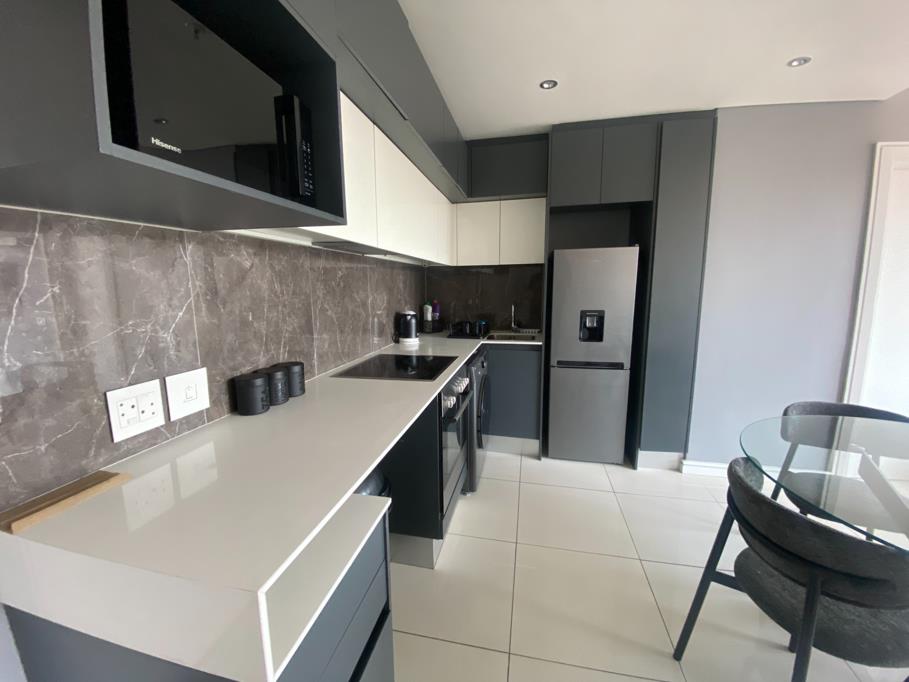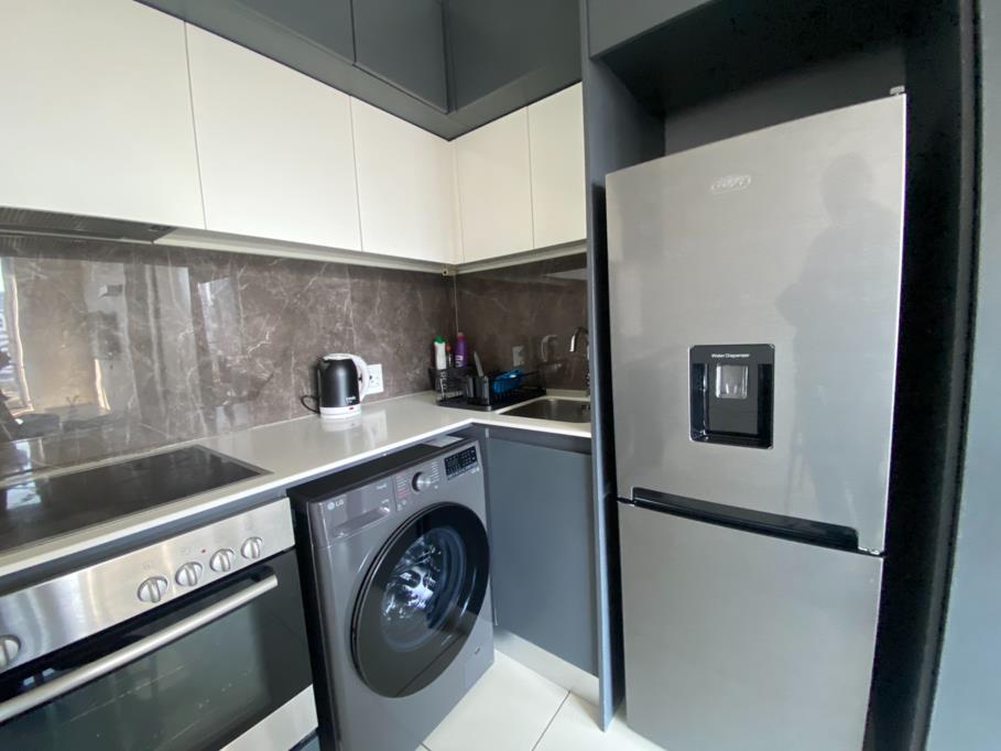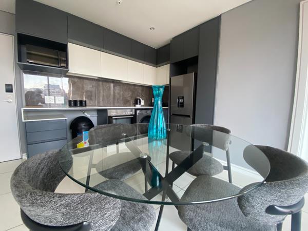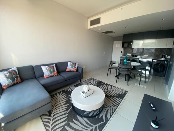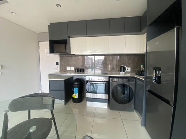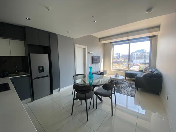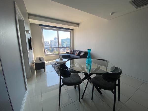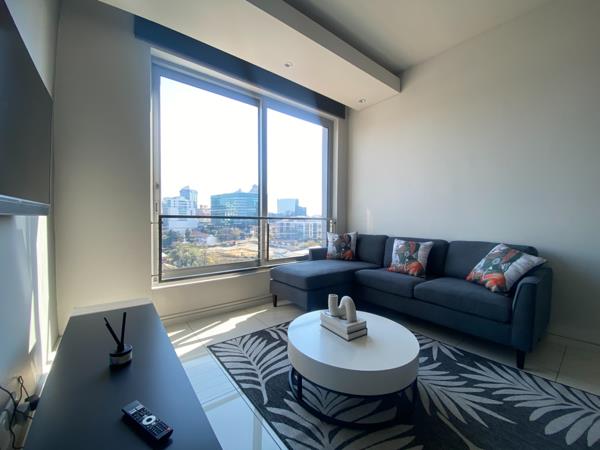 The FULLY FURNISHED 1 bedroom apartment features en-suite bedroom and contains air-conditioning, a fridge, washing machine, and well equipped kitchen and living area. This apartment is located on the 6th floor with beautiful views of the Sandton and the Johannesburg environment.