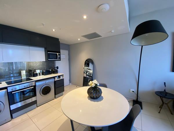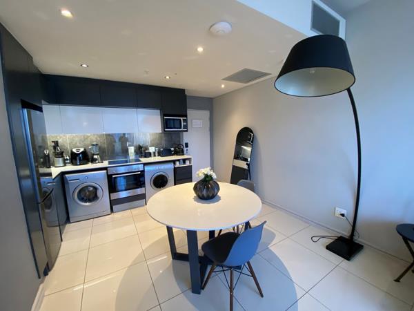 The apartment features an open-plan kitchen and lounge area, thoughtfully designed to maximise space and comfort. A cosy dining nook offers the perfect spot to enjoy meals or entertain guests. Large windows flood the space with natural light and open up to reveal breathtaking views of the Sandton skyline, where you can enjoy spectacular sunsets from the comfort of your home.