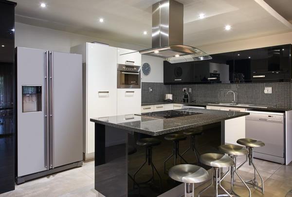 The kitchen is modern and open plan with granite counter-tops, a breakfast bar, as well as built in cupboards, a washing machine, a dishwasher, fridge , freezer, a gas cooker with an extractor fan and a stove. The appliances in the kitchen are all modern and top of the range.
