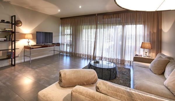 The apartment is a garden apartment which you enter through a large front door into an impressively furnished tiled living area. The dining area lounge are open plan and air-conditioned. The lounge is spacious and has sliding doors out onto the stunning private patio and roof terrace which has wonderful views of the Jukskei river, the pool and communal gardens below.