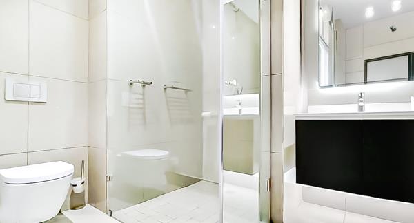 Modern bathroom with a spacious walk-in shower, elegant fixtures, and contemporary finishes