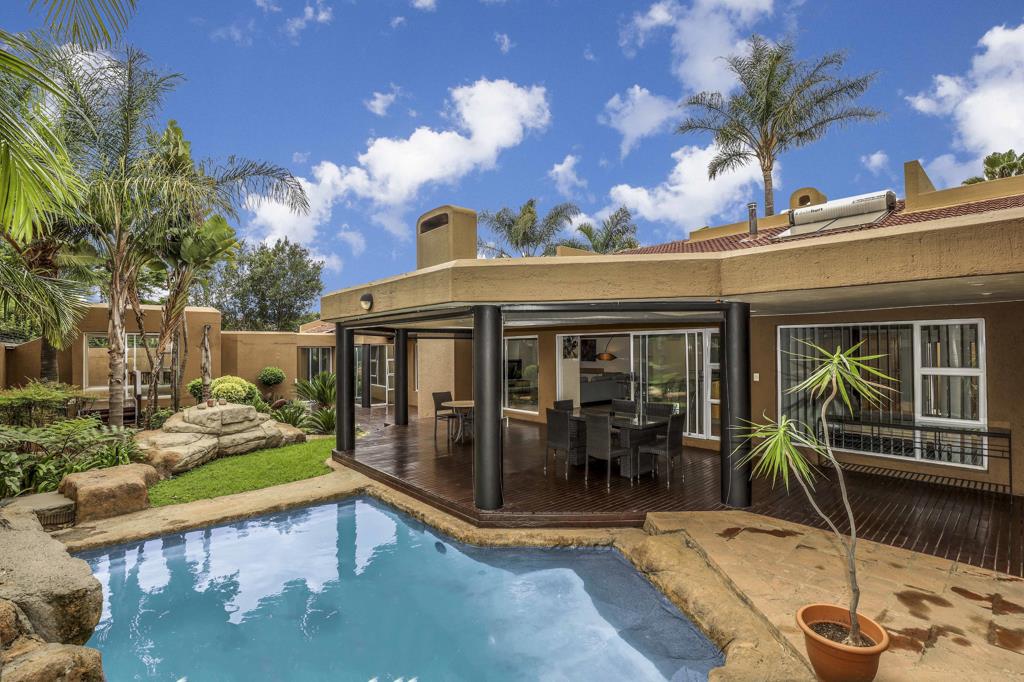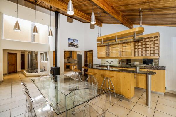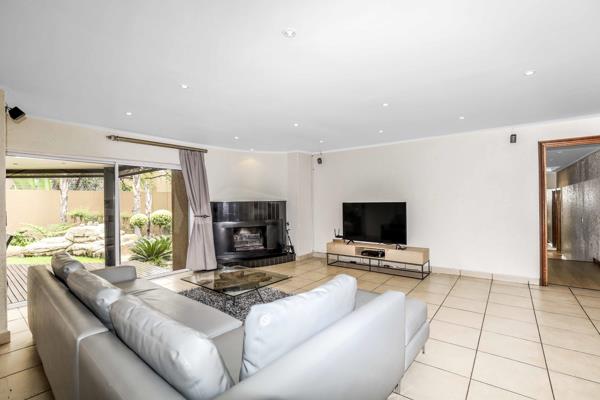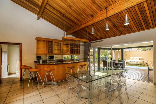 Spacious open plan lounge and dining room with fireplace and bar area leading onto a wooden deck with koi pond and braai area.