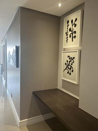 Upon entering, there is a study type setup to the left before heading through into the open-plan kitchen, dining and living area. The kitchen is equipped with Miele appliances and high-quality fittings. There is ample cupboard and countertop space. The dining and living area are beautifully furnished with a contemporary design and flow that leads onto a balcony overlooking the park.