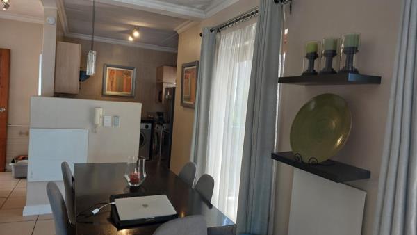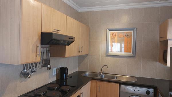 Positioned within a secure complex with a 24-hour guardhouse, this first-floor apartment combines privacy with peace of mind. The open-plan lounge and dining area opens onto a wraparound balcony, providing an inviting space to relax or entertain. The modern kitchen is fully equipped with quality appliances, including a washing machine, and tumble dryer.