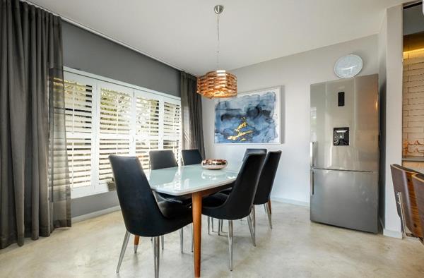 The townhouse spans a generous 142 square meters, with all living and entertainment areas located downstairs to ensure comfort and ease of living. Upon entering, you are greeted by a sleek and contemporary interior featuring a private home office, ideal for remote work or study, as well as a guest cloakroom for added convenience. The separate modern kitchen, complete with a stylish center island, is fully equipped and flows seamlessly into the open-plan dining area, making it perfect for both daily living and hosting guests. The spacious living room opens onto a covered patio with a braai bbq, creating an inviting space for relaxation and entertaining.