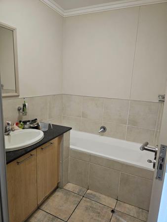 The apartment features an open-plan tiled lounge that seamlessly integrates with the dining area and kitchen. Step out onto the cozy balcony to take in the breathtaking views of Sandton.