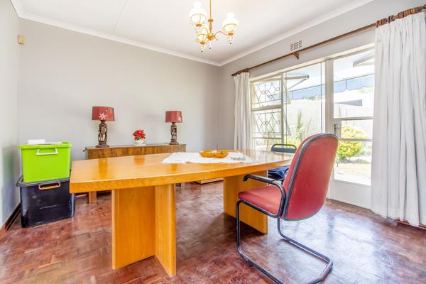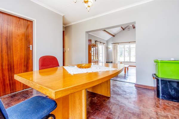 The dining room leads onto the covered patio, overlooking the pool and garden.