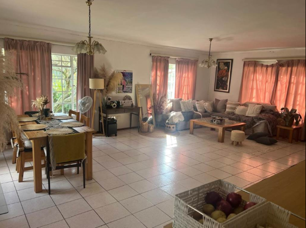 Upon entry, residents are greeted by a spacious interior featuring a dedicated lounge and a separate dining room, both designed to maximize natural light through multiple large windows. The entire living space is adorned with durable and easily maintainable tiled flooring, ensuring a practical yet refined aesthetic. The well-appointed kitchen is a focal point, boasting a large central island, ample white cabinetry, and essential provisions for culinary pursuits, fostering an inviting atmosphere for meal preparation and casual dining.
