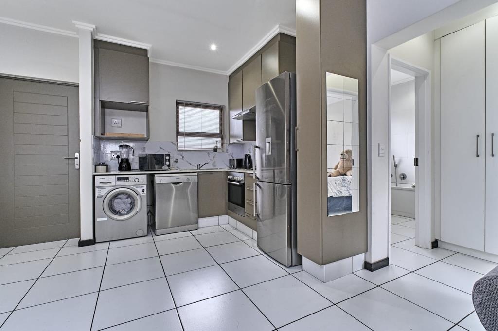 The apartment features a spacious bedroom with built-in cupboards and a full bathroom designed with clean, contemporary finishes