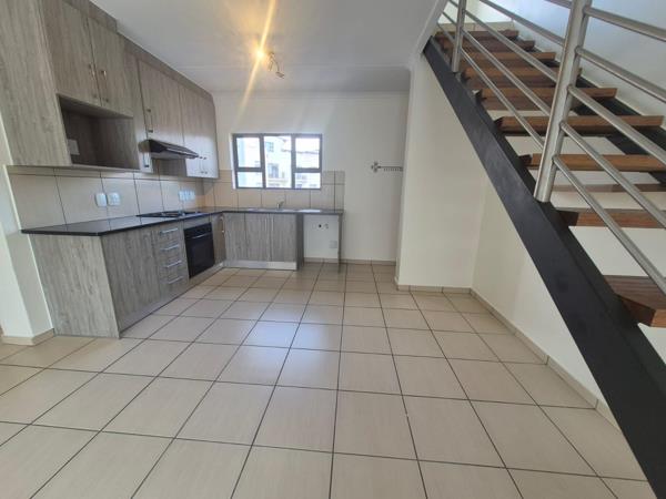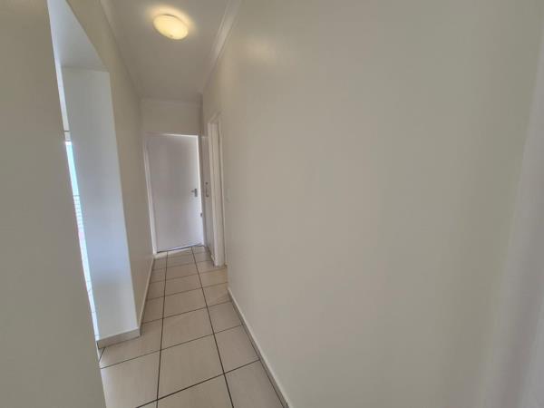Spacious top-floor apartment featuring 3 bedrooms and 2 bathrooms. The unit offers an open-plan kitchen with ample cupboard space, flowing into a lounge that opens onto a first downstairs balcony. Two generously sized bedrooms and a full bathroom are located downstairs.