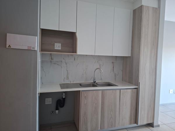The unit features a modern, open-plan layout with clean finishes that create a bright and airy feel. The contemporary kitchen, equipped with a gas stove, opens into the living area and leads out onto a balcony, providing an elevated outdoor space to unwind or enjoy your morning coffee.